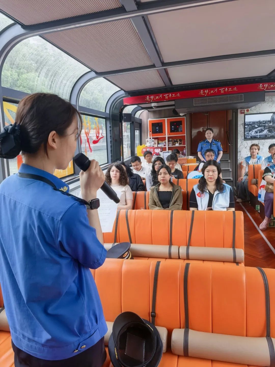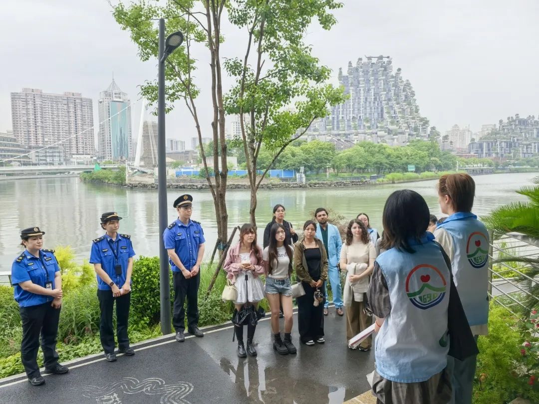 在最后的游船活动中,细雨下的苏州河泛起层层涟漪,她用自己最具情致的一面向留学生们诉说着这座城市古老与现代交织的故事。宜川路街道综合执法队法制员郭辰晨通过《上海市黄浦江苏州河滨水公共空间条例》的介绍,也让大家更深入地了解了苏州河的历史、治理的过程、以及在环境治理过程中法治的结合。通过有奖竞猜的方式,让大家知晓了武宁路桥的景观建设、“吴淞江”这一苏州河旧称,矗立在河畔的“四行仓库”等苏州河贴士。