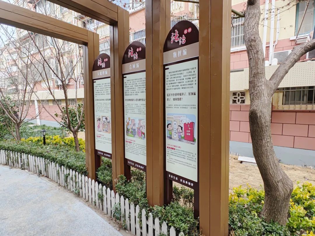 穿过亭子,便来到了法治长廊。只见,十数米的法治长廊依托小区景观嵌入法治元素,俨然成为家门口普法的重要阵地。漫步其间,一幅幅“案例+法条”相结合的民法典条例解读,“侵权责任编”“继承编”“婚姻家庭编”“人格权编”“合同编”“物权编”,法治主题的选择和解读明显经过专门挑选和梳理,配以漫画卡通,凸显法治长廊活泼、亲民、接地气的格调。