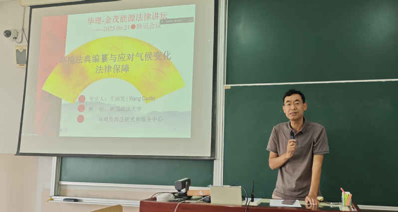6月21日上午,由法学院与上海市金茂律师事务所联合主办、华东理工大学能源与资源环境法研究中心承办的华理-金茂能源法律讲坛第四期在徐汇校区研究生楼405举行。本期讲坛以“环境法典编纂与应对气候变化法治保障”为主题,知名环境法学者、中国政法大学教授、博士生导师王灿发担任主讲嘉宾。法学院副院长孙晓东教授致辞,全国律协环境资源与能源专业委员会副主任、上海市金茂律师事务所合伙人吴荣良律师,金茂律师事务所青年律师黄启荣、李琳娜出席讲坛。线上线下共计100余人参与本期活动。法学院青年教师王雨彤博士主持本期讲坛。青年教师张婧作会议总结。