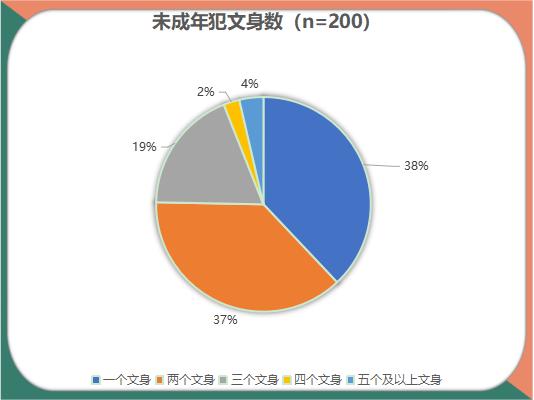 2017年F省未成年犯管教所对283名男犯进行调查,发现文身人数占比高达64%。2020年1月至2021年6月,S市检察机关受理的363名涉罪未成年人文身比重为50.51%。2022年11月,对成都未管所200名未成年犯进行随机抽样,发现83%的未成年犯都有文身,且初次文身年龄在16周岁以下的占86%,其中14周岁以下的占20.53%。