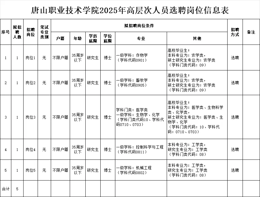 1.唐山职业技术学院2025年高层次人才选聘岗位信息表
