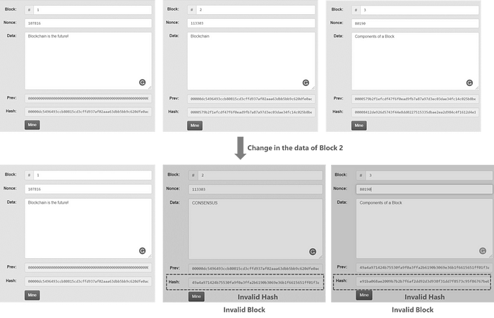 更改第2个区块的唯一方法是重新挖掘该区块以找到一个有效的哈希,该哈希具有 4 个前导 0,然后挖掘所有后面的区块以找到它们的有效哈希,因为所有区块都通过前一个区块的哈希连接在一起。由于新区块总是被添加,因此几乎不可能变更区块链。
