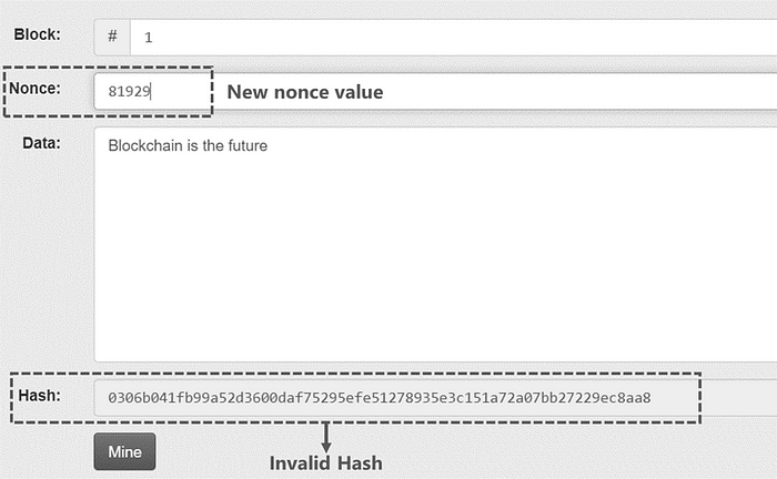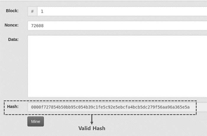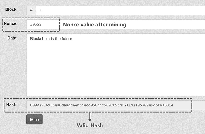 通过称为 nonce 的字段使区块有效,而 nonce 是不预定的。每当为同一区块选择新的 nonce 时,计算出的哈希将是不同的值。