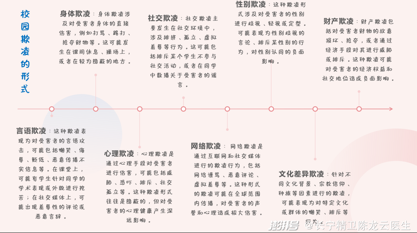 欺凌的形式多种多样,有的方式很明显,有些方式比较隐蔽,更有甚者,欺凌者本身也并没有意识到这样的行为会给别人带来伤害,只是跟朋友在“开玩笑”。校园欺凌涵盖多种形式,这些形式可能以言语、身体、心理等方式对受害者造成伤害。