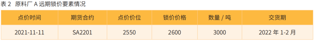 2021年11月,玻璃原料纯碱现货维持在近2900元/吨的高价,且纯碱的交割仓库、生产日期、品牌等都存在较大的不确定性,导致原料厂A的生产持续承压。永安资本选择期货远期贴水合约作为基准价,锁定一批远期低价货物。原料厂A根据纯碱SA2201合约点价分次买入现货3000吨,采购价格约2600元/吨,累计降低生产成本近90万元,成功规避价格波动风险。2021年12月中旬,永安资本根据原料厂A的个性化需求,在沙河本地仓库向其提前交付了高品质的纯碱现货,不仅帮助其缩短了20天的库存积压时间,更是额外降低了运输费用。