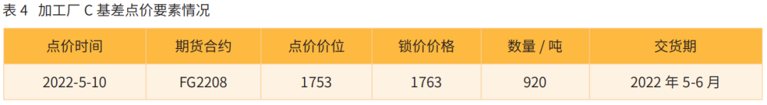 2022年5月中旬,加工厂C需要赶制一笔订单,急需采购现货原片玻璃。但其原有贸易商的原片玻璃规格不符合要求,加上现货价格在1800元/吨左右震荡,导致加工厂C面临订单违约及生产亏损的双重风险。永安资本研判玻璃行情将回归平稳,期货盘面转弱可能性较大,为加工厂C提供了基差点价的服务,在玻璃FG2209合约上进行点价,以1763元/吨的现货价格锁定5—6月份交货的920吨玻璃。此时市场价格在1820元/吨左右,原料成本降低近60元/吨,累计降低生产成本5.5万元。同时,永安资本利用贸易商厂库的货源优势,向加工厂C提供了符合规格、生产日期及品牌的玻璃,帮助加工厂C第一时间在本地的厂库自提原料,实现玻璃原料“保供不断流”。