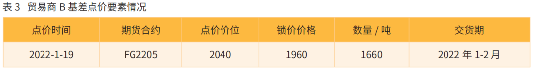 2022年1—2月,玻璃行业在淡季走出了异常的价格走势,玻璃深加工订单数超出市场预期,出厂价格从1800元/吨迅速上涨到约2300元/吨。永安资本研判盘面升水,认为正是中游贸易商销售的好时机,便主动联系贸易商B,以玻璃FG2205合约盘面价格为参考采购原片玻璃。当市场现货价格在1910元/吨左右时,贸易商B在盘面点价2040元/吨,基差为-80元/吨,最终现货成交价格定在1960元/吨,利润提高近50元/吨,不仅增加销售利润8.3万元,还实现了资金的快速回笼,增加了现货的销售渠道,规避了后期潜在的亏损风险。