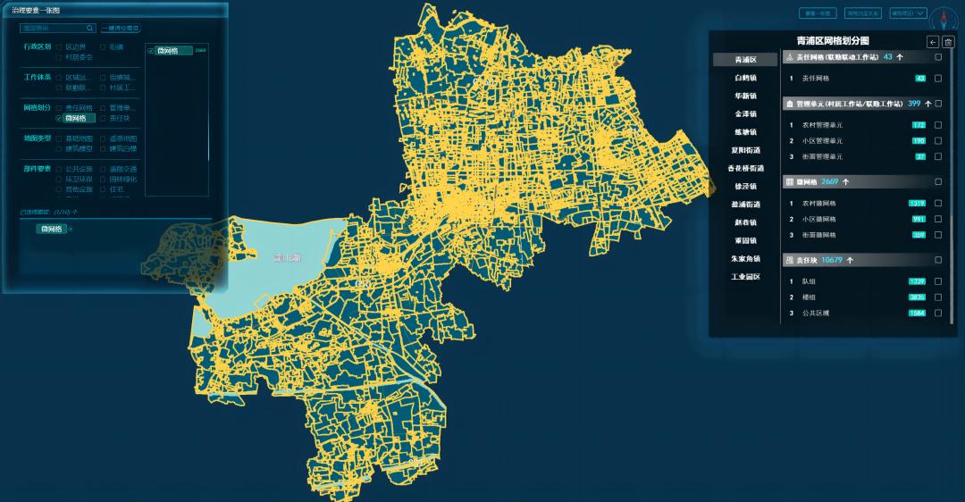 按照街镇—责任网格—管理单元(居村、街面)—微网格—责任块的网格层级体系,健全人、地、事、物、情等要素信息,青浦区划分为43个责任网格、399个管理单元、2669个微网格、10679个责任块,并全面完成网格落图和人员信息上线工作,各条线、各部门人员力量下沉微网格,实现“人在格中走,事在格中办”。
