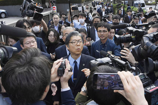 ▲“统一教”代理律师福本伸弥(中)在裁决令下达后离开东京地方法院时被记者包围