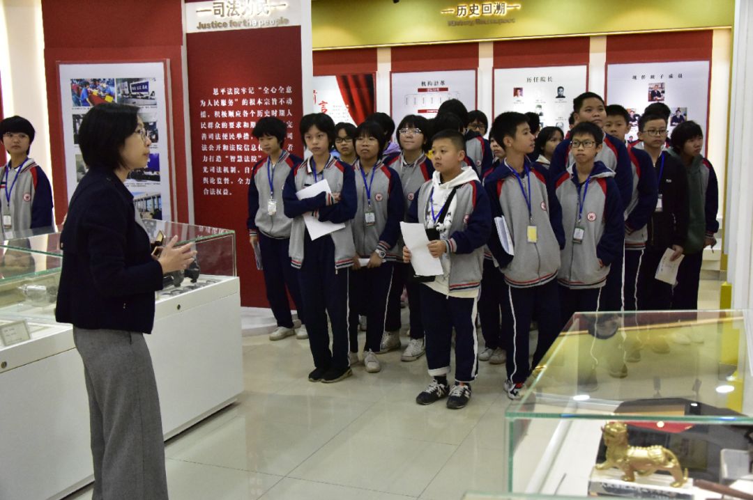 在讲解员的指引下,同学们参观了院史室、诉讼服务中心、执行指挥中心、走廊文化等功能区,并观看了扫黑除恶宣传展板。参观行程中,对于法院的发展历史和各类展品,同学们既好奇又兴奋。为了加深同学们的印象,讲解员还对部分具有代表性的陈列物件进行介绍,讲述物品承载的法治故事。