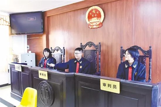 模拟法庭内座无虚席,高悬的国徽、庄严肃穆的“法庭”、神情黯然的“被告”……