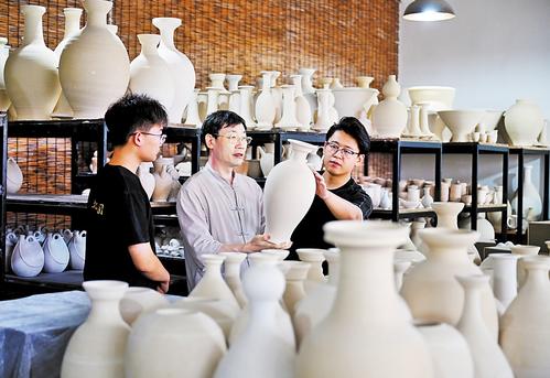 7月2日,在临城县邢窑文化博览园,国家级非遗项目邢窑陶瓷烧制技艺代表性传承人张志忠(中)为邢台学院学生讲解邢窑白瓷上釉知识。《邢台市邢窑文化保护传承利用条例》的实施,为当地开展邢窑文化保护传承利用工作提供了有力法治支撑。 本报记者 赵永辉摄
