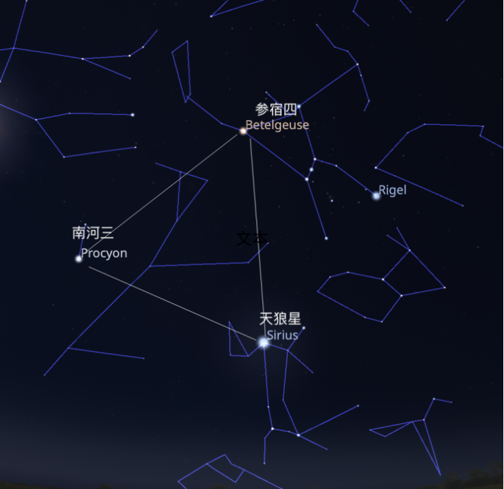 下面这张图里的三角形,称为“冬季大三角”。它是由大犬座最亮的恒星天狼星(大犬座α),小犬座最亮的恒星南河三(小犬座α)以及猎户座的参宿四一起构成。