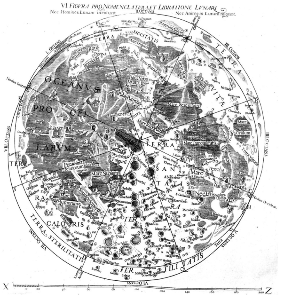 知道了太阳系的“神”之家族,让我们回到与地球最接近自然天体——月球。月球上的大多数地貌是由意大利天文学家乔瓦尼·巴蒂斯塔·里乔利(Giovanni Battista Riccioli)命名的。他于1651年发表的《新天文学大成》(Almagestum Novum)中创立的月球命名体系成为了月球地貌的标准化的名称。下图为《新天文学大成》中所绘制的月球地貌。其中大部分地貌的命名都被沿用至今。