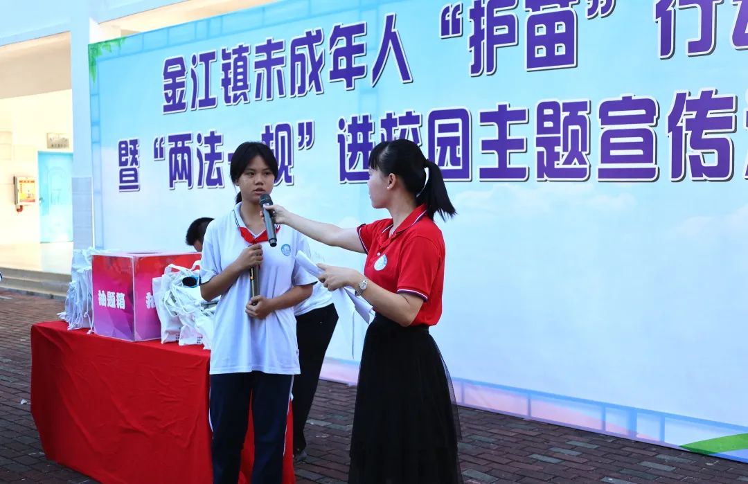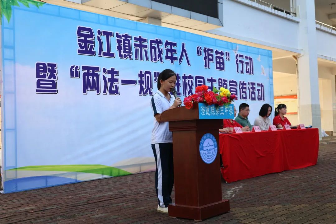 活动开始,由学生代表发言,号召同学们认真学习法律知识,树立维权观念,学会用法律维护自己的合法权益。随后金江派出所民警王进树同志针对未成年人保护知识进行宣讲,通过一个个案例深入浅出地教育学生们要加强自我保护意识,并对学生在校园生活中存在的疑惑进行现场答疑。