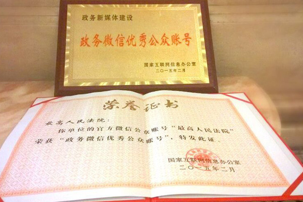 2月6日上午,由国家互联网信息办公室主办的政务新媒体发展经验交流会暨表彰会在河北石家庄召开。会议介绍了政务新媒体的建设发展情况,并通报表彰了全国政务微信优秀公众帐号。最高人民法院官方微信荣获“政务微信优秀公众帐号”。这是国家网信办综合各政务微信号的传播力、影响力、服务力等评选而出,该奖项是国家级互联网主管机构对最高法院新媒体的认可。