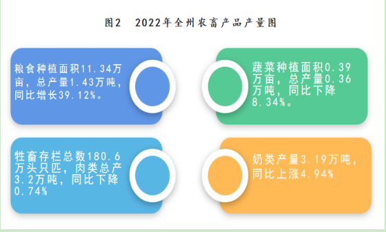 2022年,全州农作物总种植面积20.15万亩,同比增加1.97万亩。其中,粮食种植面积11.34万亩,同比减少0.19万亩。在粮食作物中,马铃薯种植面积1.34万亩,同比增长20.06%;青稞种植面积9.77万亩,同比下降4.05%;豌豆种植面积0.23万亩,同比下降34.65%。油料种植面积0.43万亩,比上年减少0.03万亩;蔬菜种植面积0.39万亩,比上年减少0.04万亩;其他作物种植面积7.99万亩,同比增长38.72%。在农产品产量中:粮食总产量1.43万吨,同比增长39.12%;油料总产量309吨,同比下降45%;蔬菜产量0.36万吨,同比下降8.34%。