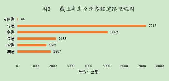 2022年,全州258个建制村“两通”兜底目标基本完成,建制村通客车率达100%,实现了有条件的建制村全部通客车。完成公路客运量24.7556万人,货运量10.03万吨。截止2022年底,全州公路总里程17974.507公里。其中,国道1867.033公里、省道1621.071公里、县道2167.933公里、乡道5061.835公里、村道7212.228公里、专用道44.407公里。