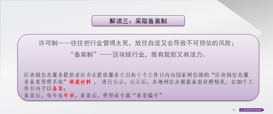 未来将采取备案制对区块链项目进行管理,之前坊间猜测会不会是许可制?所谓的许可其实就是政府机关给大家一个牌照认可,但是许可制往往会把行业管得太死,可能会堵塞创业人的激情。取用中间的“备案制”实际上是释放一个信号,允许你做,但是要守规矩,监管机构希望区块链行业,既有规矩又有活力。大家可以看到新规里规定了,10天时间填报材料;然后进行公示,公示之后,20天备案审核。还有年审制度,每年审核,年审可以直接理解为长效机制,持续监测动态。