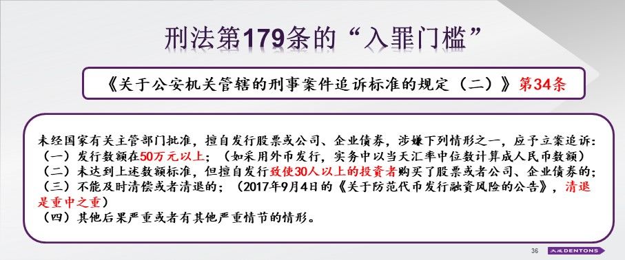 另外,需要注意,“入罪门槛”是指发行数额在50万以上,人数是30人。罪名门槛其实不高,一旦有这样人数的规定,实际意味着中国《刑法》要出来发挥作用了。