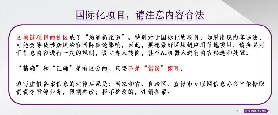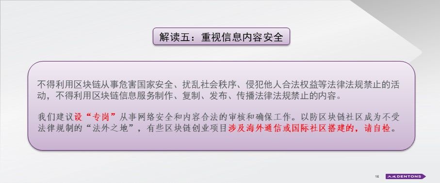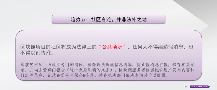我们发现,在一些非理性维权的事件中,区块链项目的社区成了“沟通新渠道”。特别对于国际化的项目,如果出现内容违法,可能会导致涉众风险和国际舆论影响,因此,要想做好区块链应用落地项目,请务必对于信息内容进行一定的规制,设立专人转岗,甚至AI机器人进行内容筛选和处置。