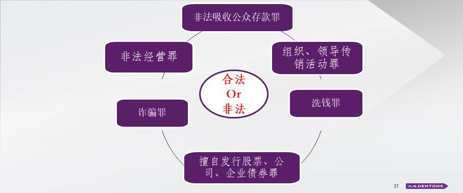 最后讲讲,币圈可能会触及的行为边界。行为边界之一是非法吸收公众存款罪,凡是用法币进行募集的罪名都很常见。中国对于法币的理解是别国的法币也是法币,也会按照《刑法》第176条非法吸收公众存款罪进行处理,如果个人募集资金达到20万,企业募集资金达到100万就构成犯罪。