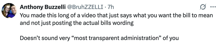 该视频在社交平台X上引发争议。有网友表示,“你们制作了一个这么长的视频,只说了你们希望这个法案能表达的意思,而不是直接发布法案的具体内容。这不像你们说的‘最透明的政府’。”↓