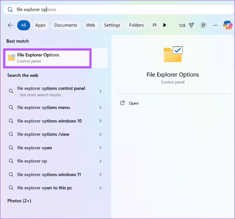 步骤1:按 Windows键,搜索 文件Explorer选项 ,然后单击以打开它。