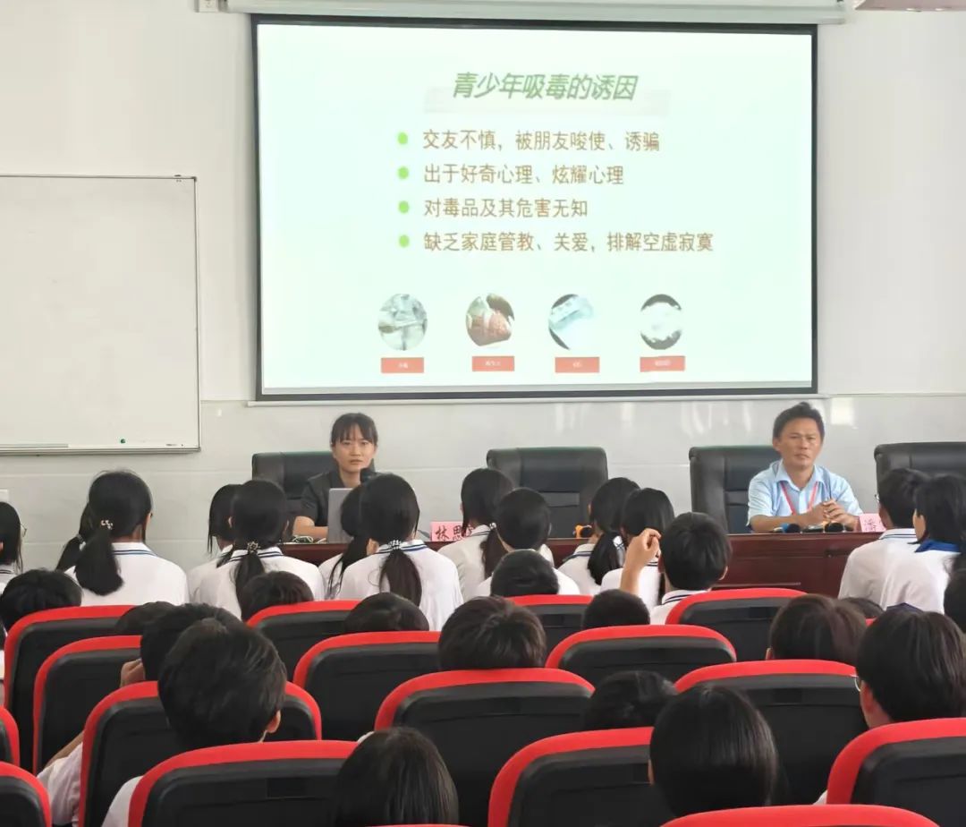 当林思颖书记员播放“彩虹烟”“ 跳跳糖”等毒品的陈列视频时,惊呼声此起彼伏。“这包‘奶茶’和我抽屉里的简直一模一样!”同学们瞪大了双眼。符亮法官助理介绍教学视频中的毛发检测仪更让同学们直观看到:毒品痕迹半年都洗不掉。