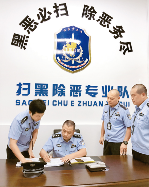 福建省宁德市公安局蕉城分局原副局长杨春同志从警28年,始终奋战在维护稳定、打击犯罪、服务群众第一线,用热血和生命忠实践行了对党忠诚、服务人民、执法公正、纪律严明的总要求。2019年8月,中共中央宣传部向全社会发布杨春同志先进事迹,追授杨春同志“时代楷模”荣誉称号。图为杨春同志(左二)与扫黑除恶专业队队员分析案情(2018年摄)。新华社发 宁德市公安局蕉城分局供图