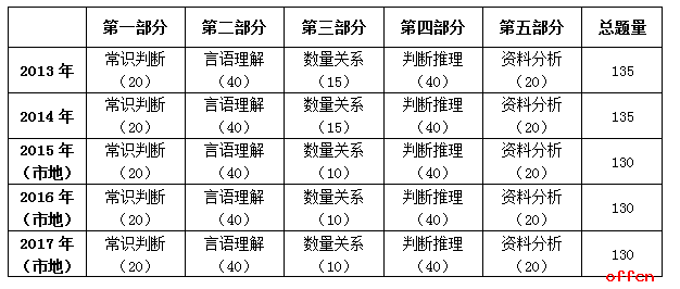 数量关系题量依然比副省少5道小题,其他部分题量一致,其他部分考查题型题量与去年相比基本相同。请详见下表。