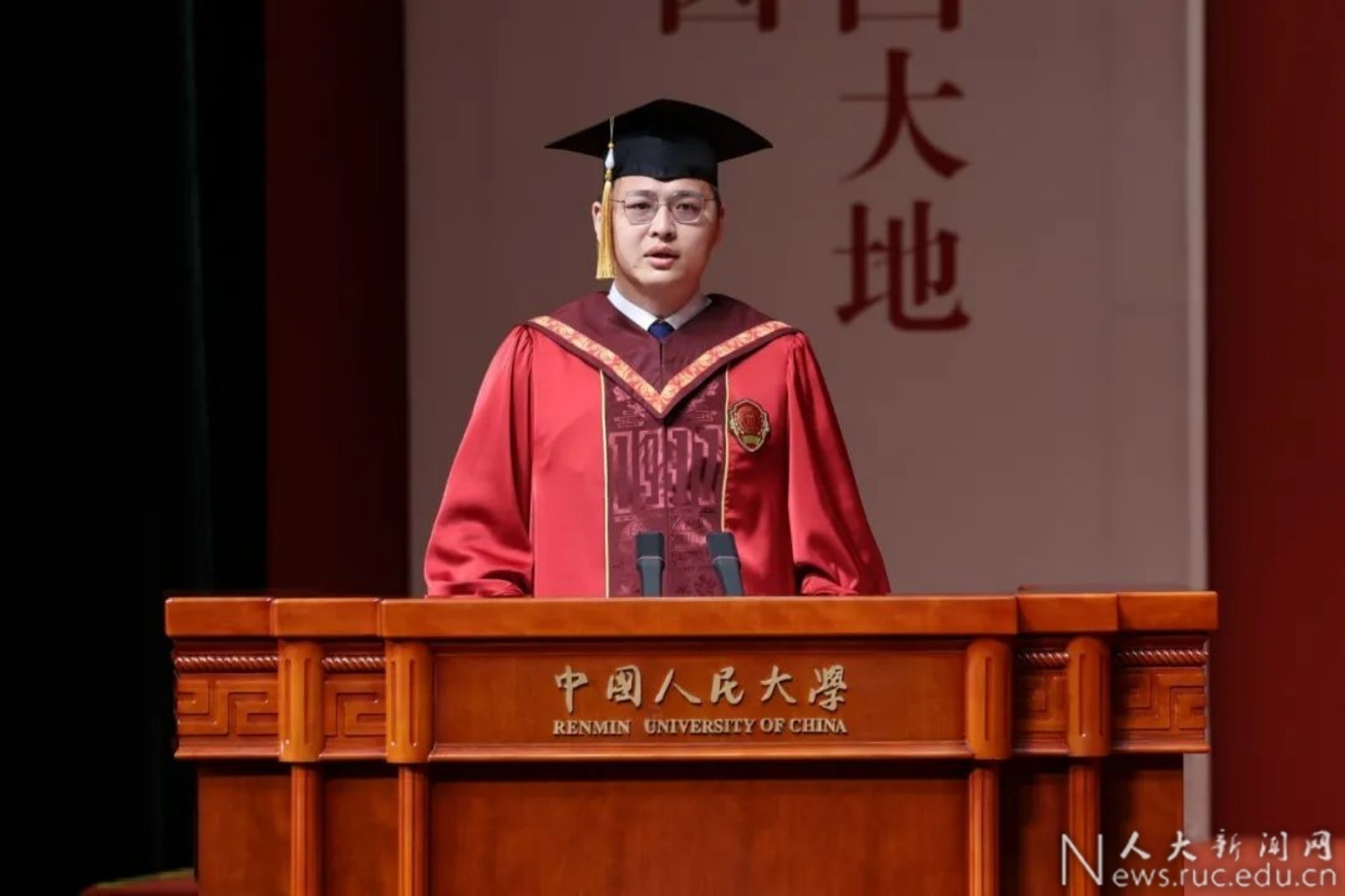 研究生指导教师代表、法学院教授陈卫东表示,自陕北公学一路走来,“革命先锋队”的精神火种始终在人大人手中代代传承。希望各位同学始终保持对学术的热爱,以学术实践服务社会发展,用专业知识解决现实难题;坚守道德责任,以“胸怀坦白、忠诚正直”的品格,抵制不良风气、引领社会风尚,做堪当民族复兴重任的“革命先锋队”;牢记初心、不忘嘱托,以具有政治远见的格局,在中国式现代化的征程中刻下独属这代人的坐标,为强国建设、民族复兴伟业贡献力量。