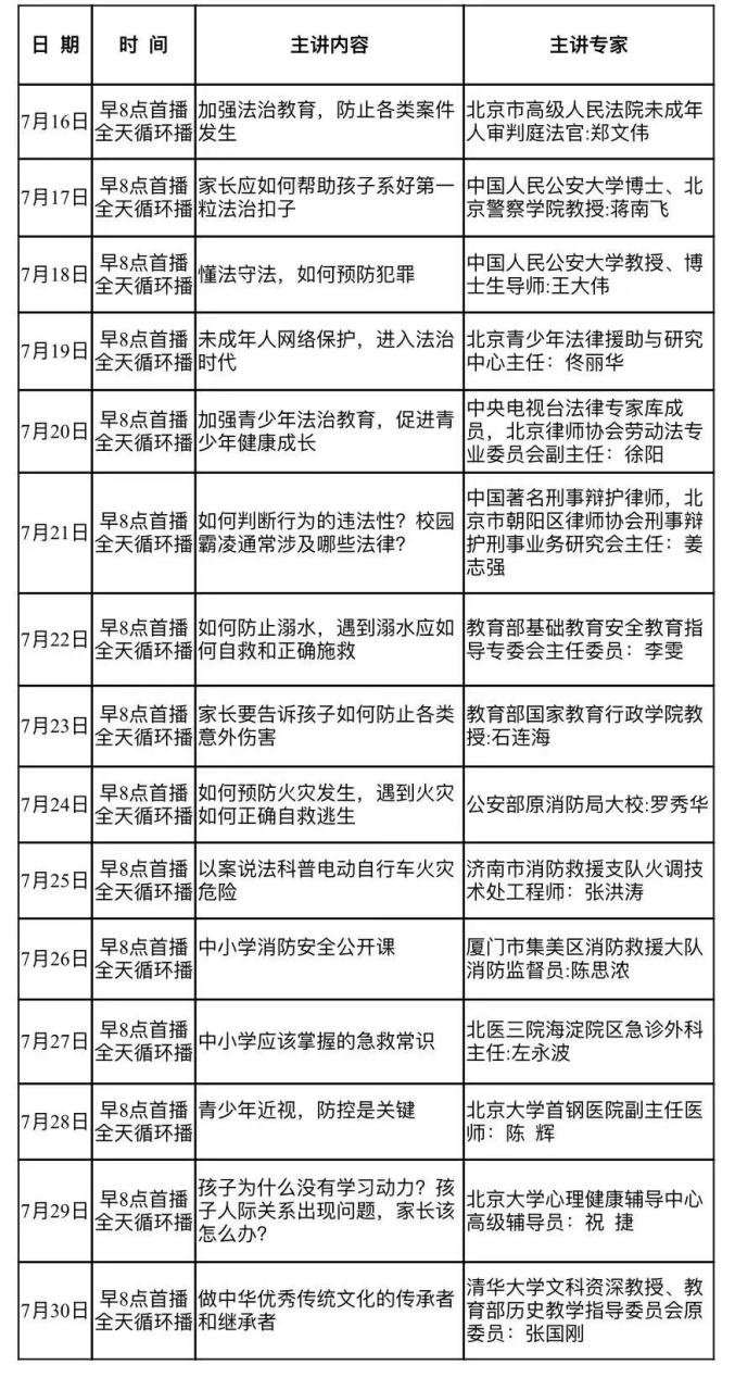 2025年7月16日至7月30日,通过中国教育网络电视台新媒体号连续播出15天,每天1讲,24小时循环播出。累计学习10天以上的,可获得《2025年暑期青少年法治安全教育公益课堂学习证书》。具体收看方式和课程内容详见附件。