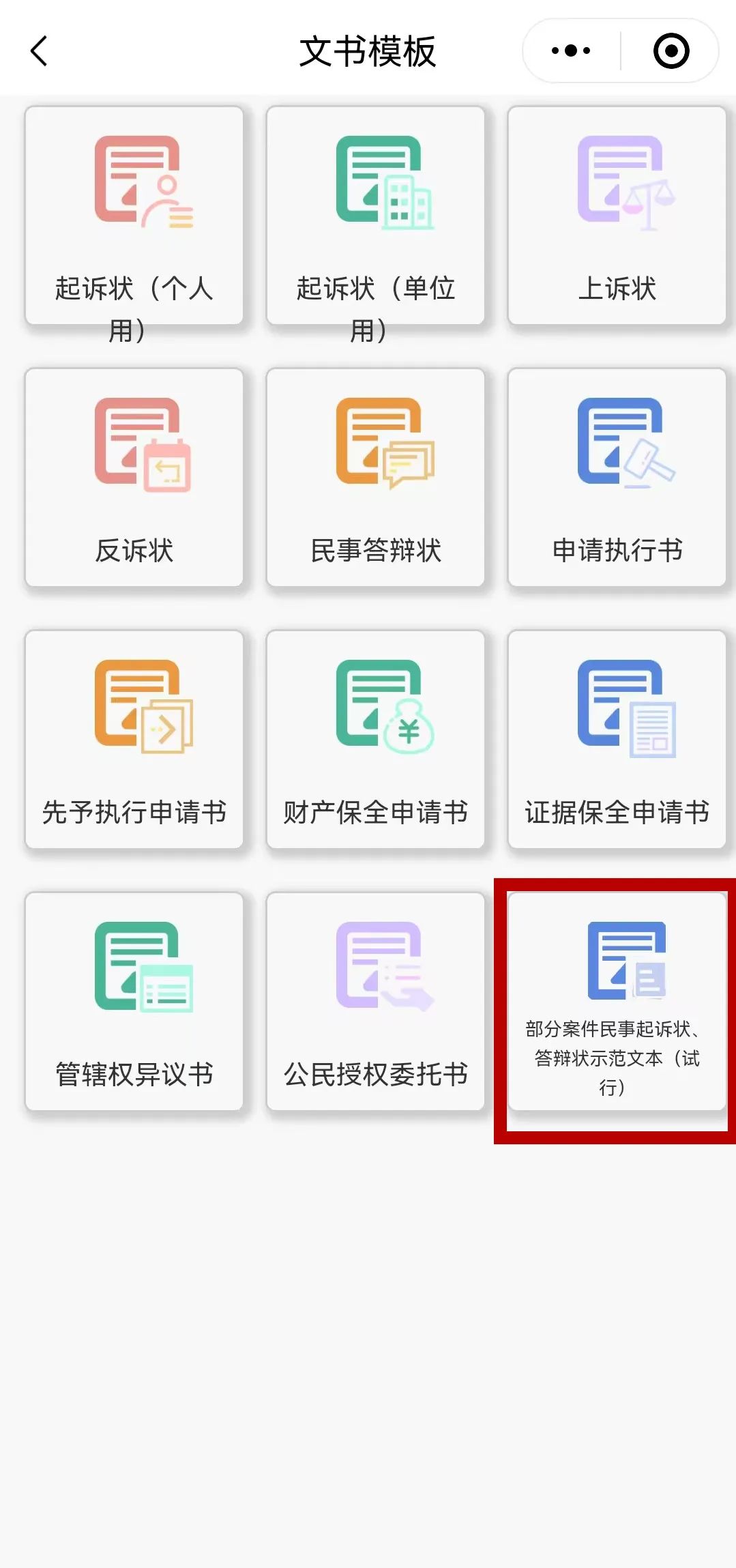 只需动动手指,就能足不出户获取模板!打开微信搜索“人民法院在线服务”小程序(首次使用记得完成注册和身份验证哦),下拉页面找到【辅助工具】,点击【文书模板】,再选择【部分案件民事起诉状、答辩状示范文本(试行)】,想要的模板直接下载!不管是在家、在公司,还是路上,随时都能轻松搞定文书准备工作!