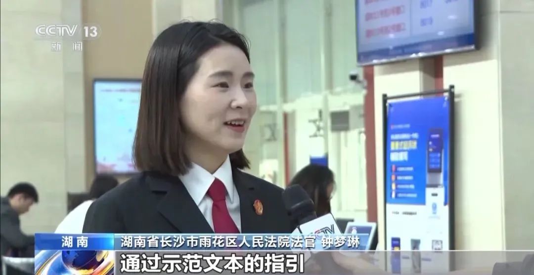 湖南省长沙市雨花区人民法院法官 钟梦琳:通过示范文本指引,当事人和律师能够更精准地准备诉讼材料、展开辩论,也便于我们通过技术手段进行要素的提取和对比,更好帮助他们快速确定争议焦点,有针对性地开展调解和审理等工作,提高纠纷的解决效率。