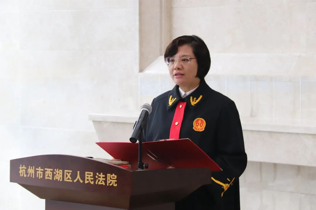 宣誓仪式上,叶青代院长向区人大常委会长期以来对法院工作的关心支持表示衷心的感谢!向新任命的同志表示热烈祝贺!向为法治工作辛勤奋斗的全院干警们表示诚挚的慰问!她指出,西湖法院下一个阶段的工作目标和理念,是“争创领头雁法院,争做排头兵法官”。