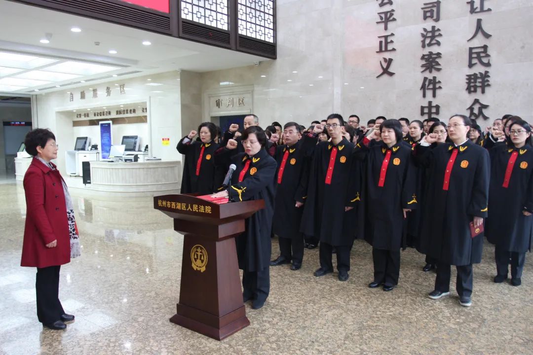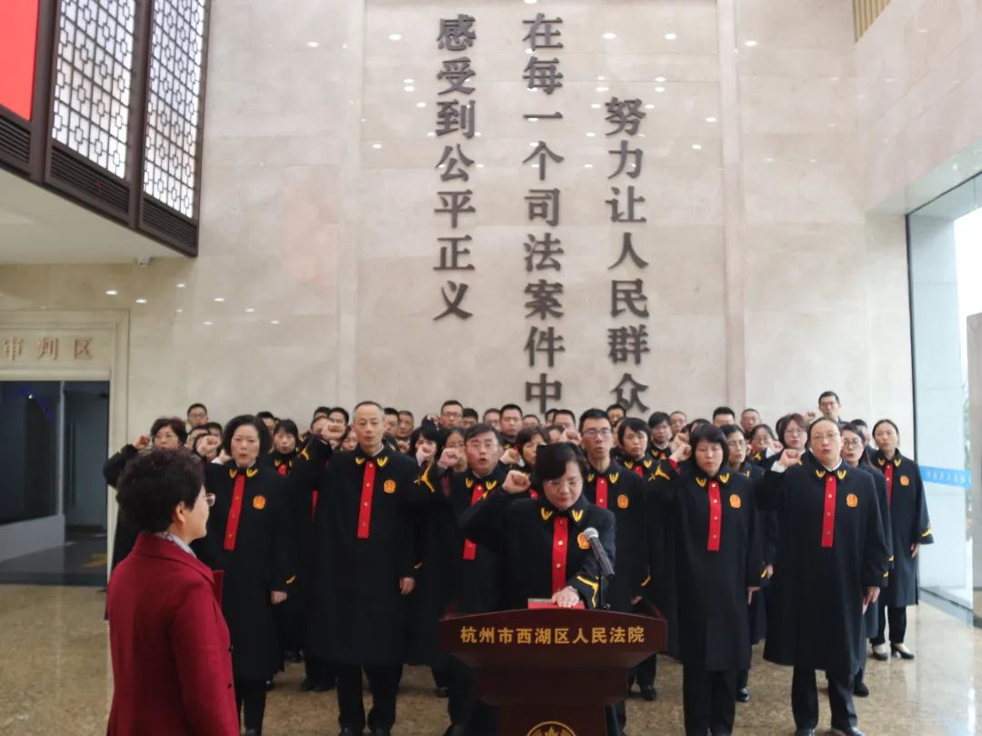 12月3日,西湖法院举行宪法宣誓仪式,区人大常委会副主任谢作珍、西湖法院党组书记、代院长叶青出席活动,全体员额法官参加宣誓。