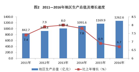 经济增长:初步核算,全年实现地区生产总值1262.6亿元,比上年增长6.7%。其中,第一产业增加值0.6亿元,下降7.7%;第二产业增加值269.4亿元,增长10%;第三产业增加值992.6亿元,增长5.8%。