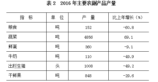 全区粮食播种面积595亩,比上年下降54.1%。粮食产量152吨,下降60.8%;粮食亩产254.6公斤,下降14.8%。