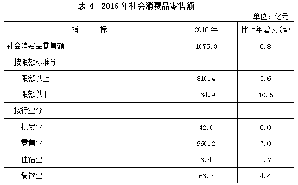 全年实现社会消费品零售额1075.3亿元,比上年增长6.8%。在限额以上批发和零售企业中,汽车类实现零售额251.9亿元,增长4.5%;食品类实现零售额61.5亿元,增长2.9%;中西药品类实现零售额17亿元,增长23.5%。