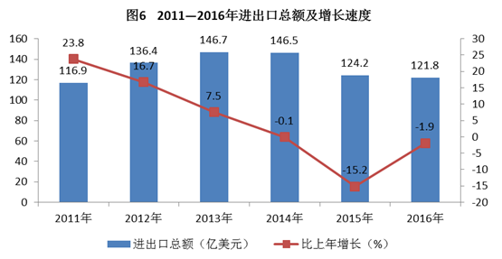 全年海关进出口总额121.8亿美元,比上年下降1.9%。其中,进口94.4亿美元,下降5.4%;出口27.4亿美元,增长12.3%。