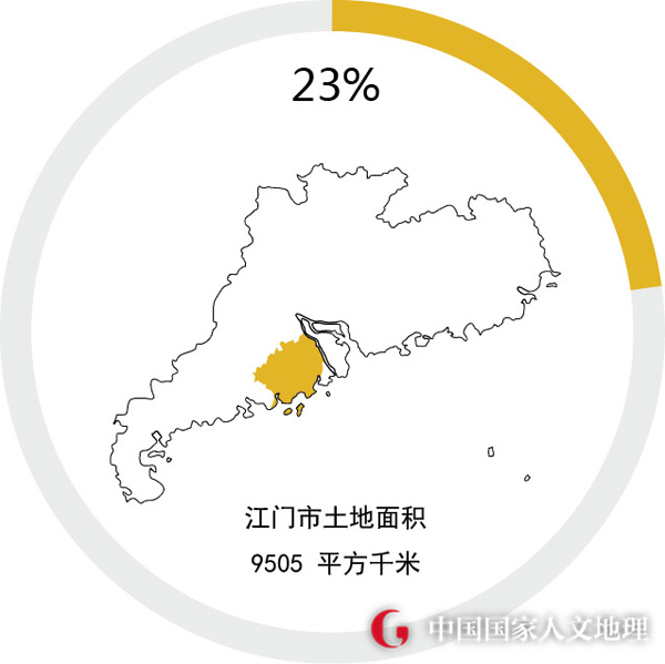 江门市地处广东省的中南部、西江下游,居珠江三角洲西部,土地面积9505平方千米。约占珠江三角洲土地面积的23%。
