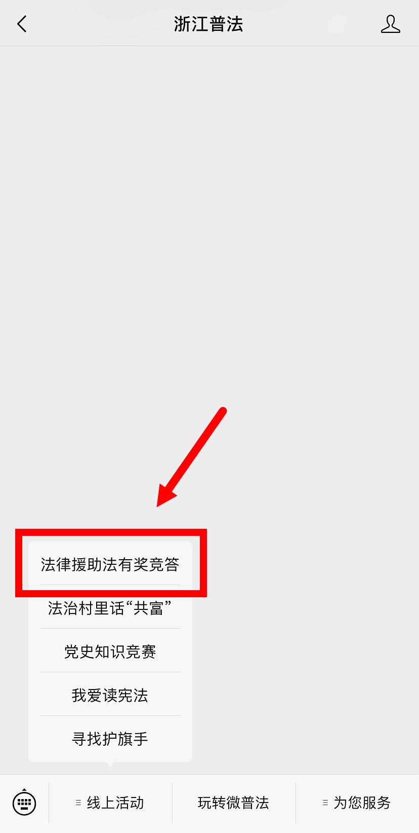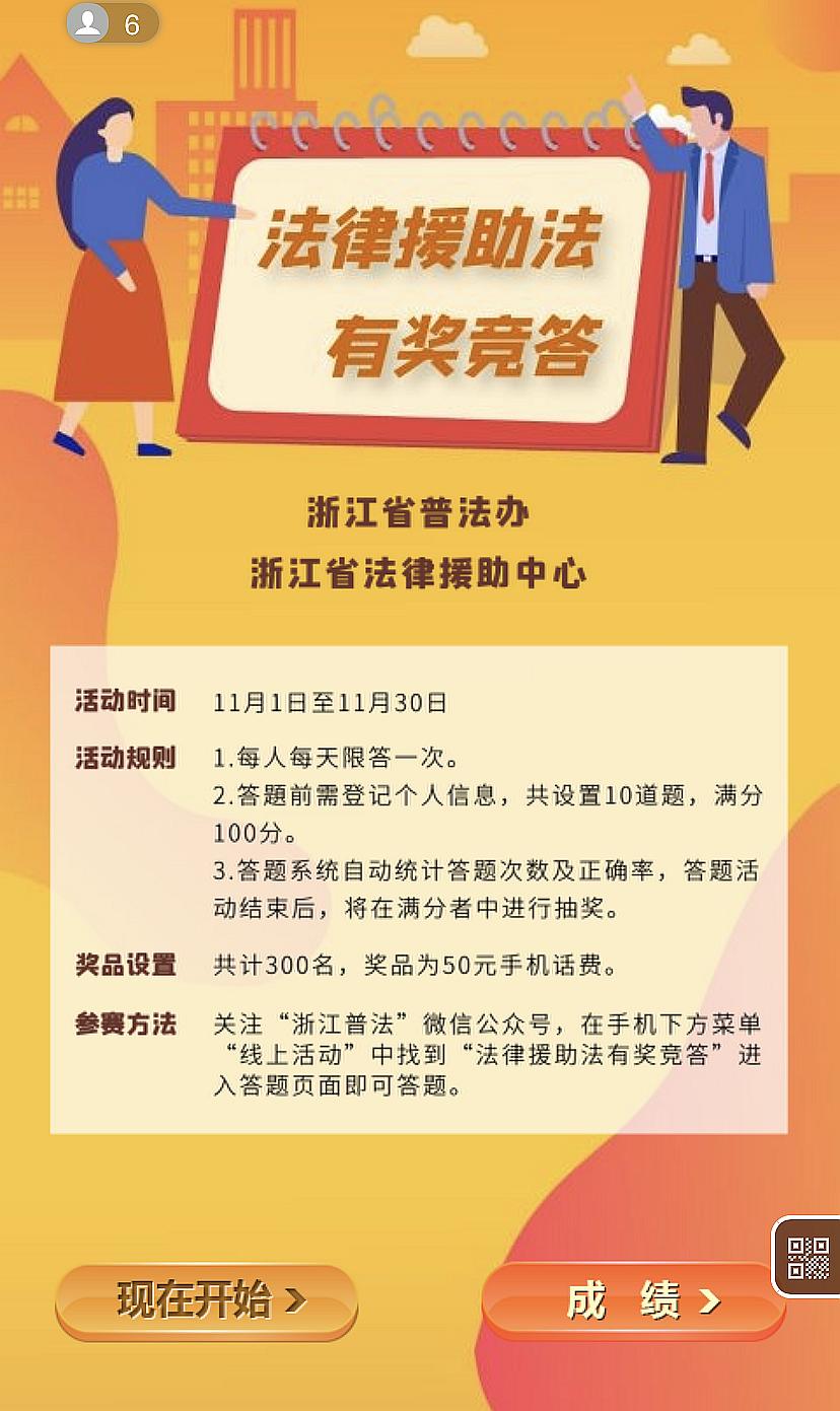 ★方法二:扫描下方二维码关注“浙江普法微信公众号”,在微信菜单“线上活动”栏目的子菜单中找到“法律援助法有奖竞答”进入答题页面,在登记个人信息成功后,即可答题。