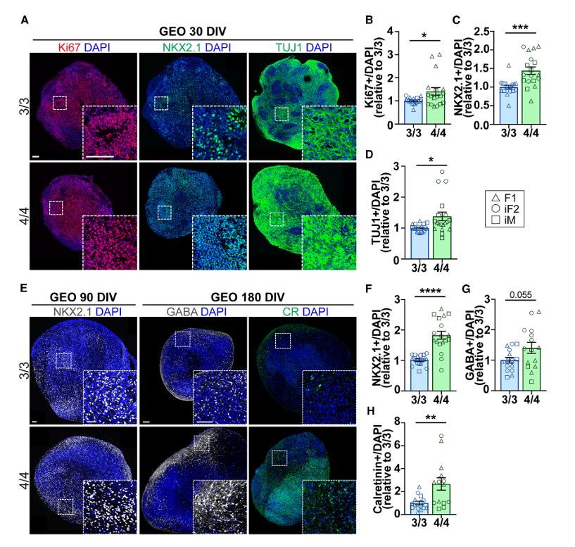 而在GEOs中,APOE4则上演了截然不同的“剧本”。在神经发生阶段,APOE4加速了GABA能神经前体细胞的增殖与分化,表现为Ki67+增殖细胞、NKX2.1+前体细胞和TUJ1+未成熟神经元的数量显著增加。这种早期的“加速分化”效应持续到发育后期,使得APOE4 GEOs中GABA+和Calretinin+(CR+)成熟GABA能神经元的数量明显增多,暗示APOE4可能通过促进GABA能神经元的成熟来重塑抑制性神经网络。