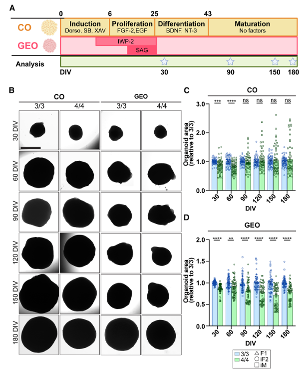 图1. 皮质类器官(COs)和神经节隆起类器官(GEOs)的生成及类器官大小分析