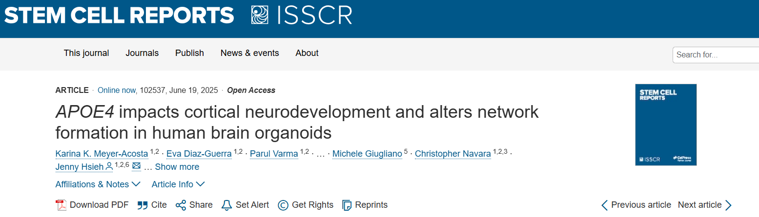 Meyer-Acosta KK, Diaz-Guerra E, Varma P, et al. APOE4 impacts cortical neurodevelopment and alters network formation in human brain organoids. Stem Cell Reports. Published online June 6, 2025. doi:10.1016/j.stemcr.2025.102537