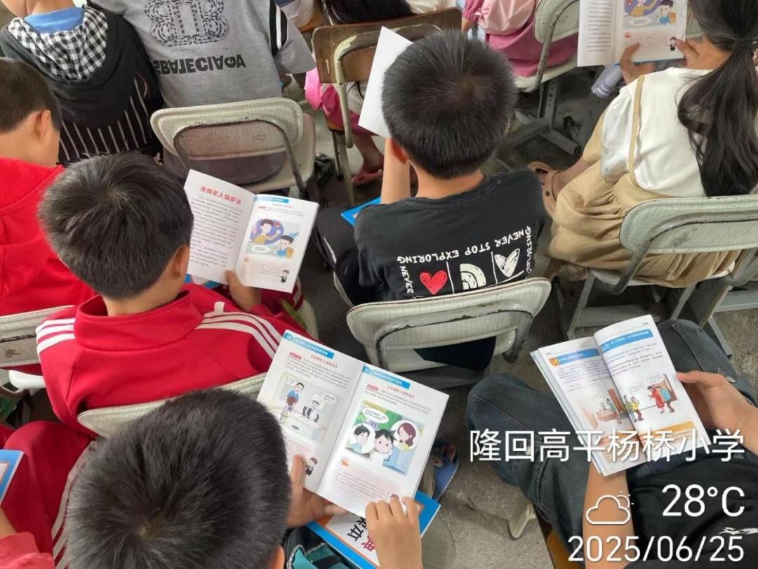 为筑牢偏远山区未成年人法治保护屏障,6月25日,隆回法院干警欧阳晓东带队走进高平镇杨桥小学,为六十余名师生开展"送法进校园"法治宣讲活动。