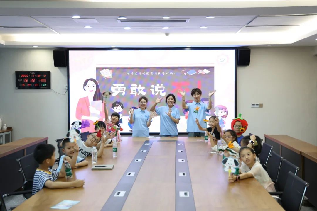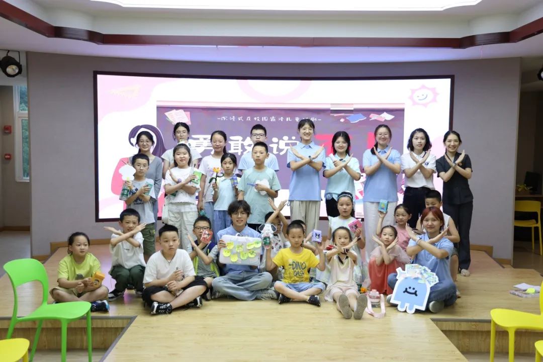 法院干警联合知识产权学院师生们将法律知识融入沉浸式戏剧教育,推出反校园霸凌主题剧本《勇敢说不》,组织孩子们现场演绎。剧本以“小艾”的遭遇为主线,通过四幕场景生动展现了语言欺凌、财产欺凌、人身欺凌和关系欺凌的多种形式。在“时光重现”环节,孩子们分角色演绎霸凌者、受害者、旁观者等不同立场,直观体会霸凌对他人造成的伤害。随后的“勇气凝结”环节,通过书写爱心贴纸、集体朗诵反霸凌宣言等方式,引导孩子们学会勇敢说“不”,并懂得运用法律武器保护自己和他人。
