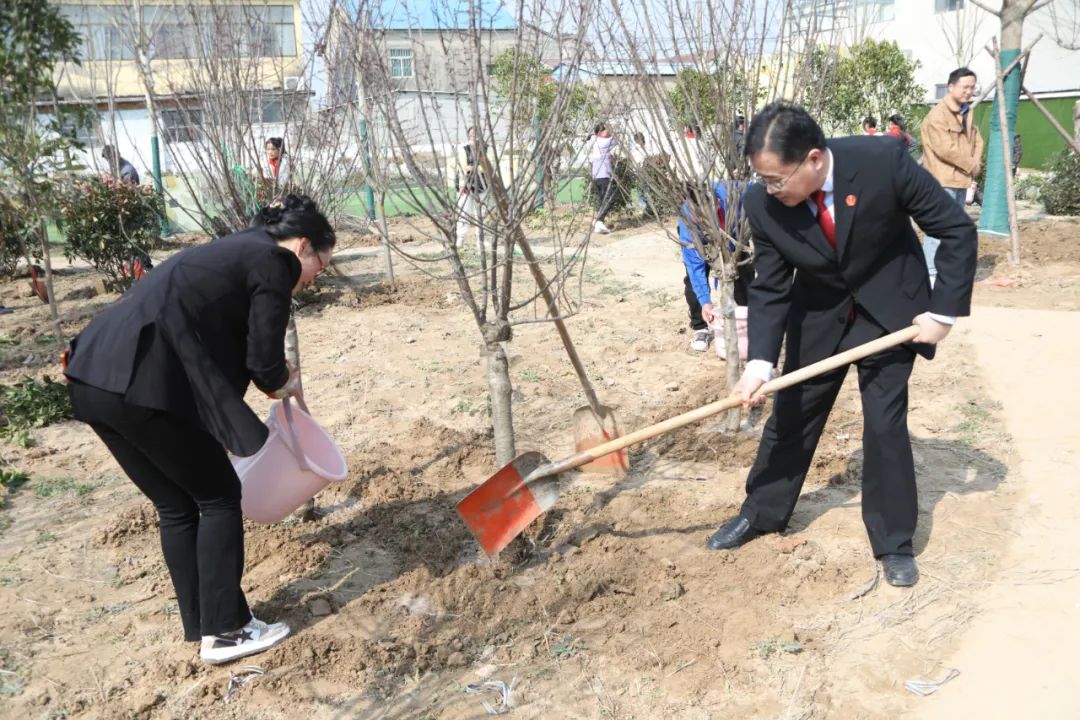 灌南县人民法院党组书记,院长李作超等院领导共同参加了本次植树活动。在李作超院长的带领下,法院干警们和同学们就地拿起铁锹,拎起水桶,将一棵棵象征着成长与希望的幼苗扶好,你松土,他浇水,她填坑,各个环节井然有序。一棵棵小树苗稳稳地扎根在泥土里,向阳而生,向风而行。期待着这些小树苗在未来长成参天大树,以点点绿荫为人们带来清凉。