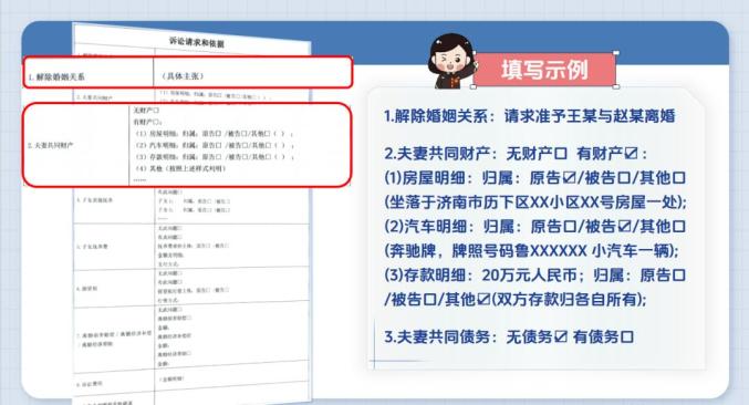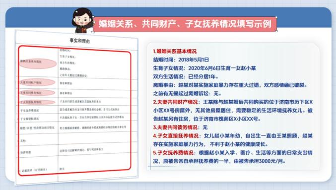 第四,在填写事实和理由部分时要针对所提诉讼请求全面阐述相关事实,包括婚姻关系基本情况、共同财产、共同债务、子女抚养等。特别提醒大家注意:如果存在分居情况,应列明双方分居的具体时间及原因。